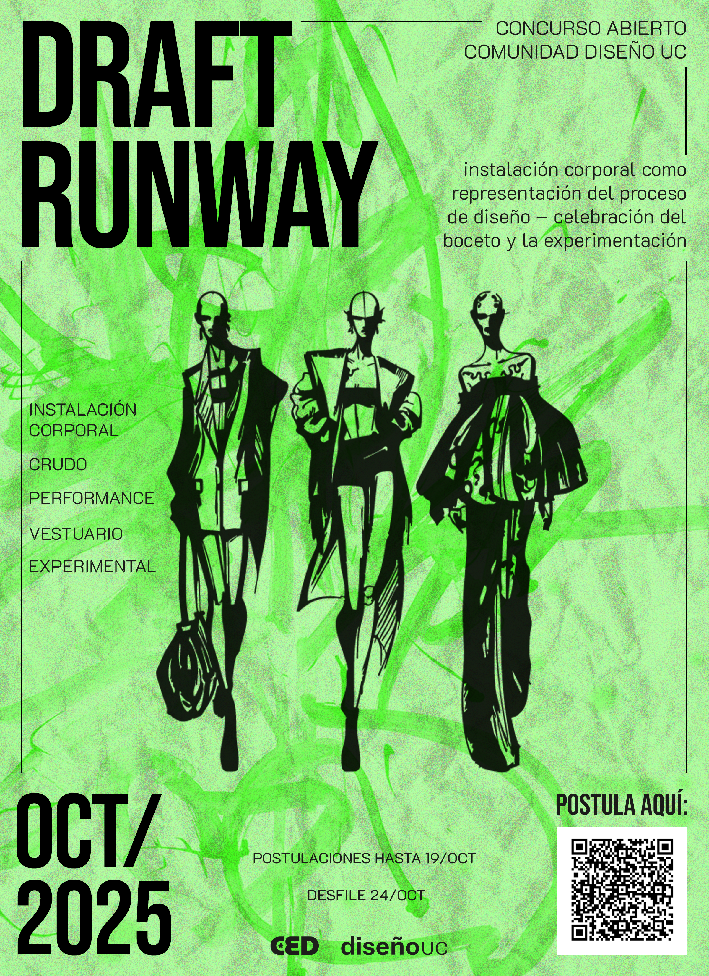 El Centro de Estudiantes de Diseño UC (CED) abre la convocatoria a “Draft Runway”, un concurso y desfile que celebra, por medio de una instalación corporal, los procesos de diseño y visibiliza lo inacabado e imperfecto desde una experimentación material. El desfile final y la premiación se realizarán el viernes 24 de octubre de 2025, en campus Lo Contador.