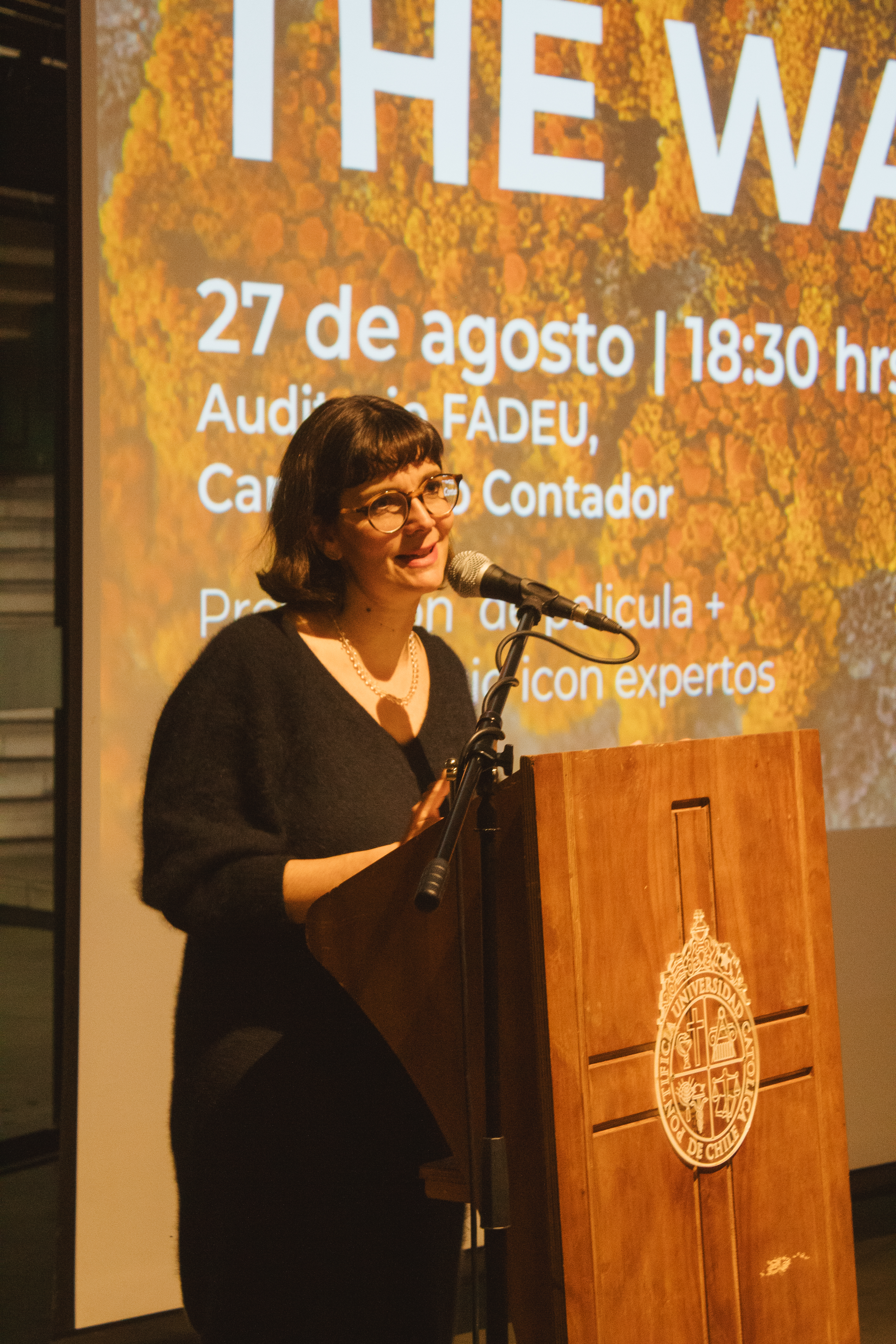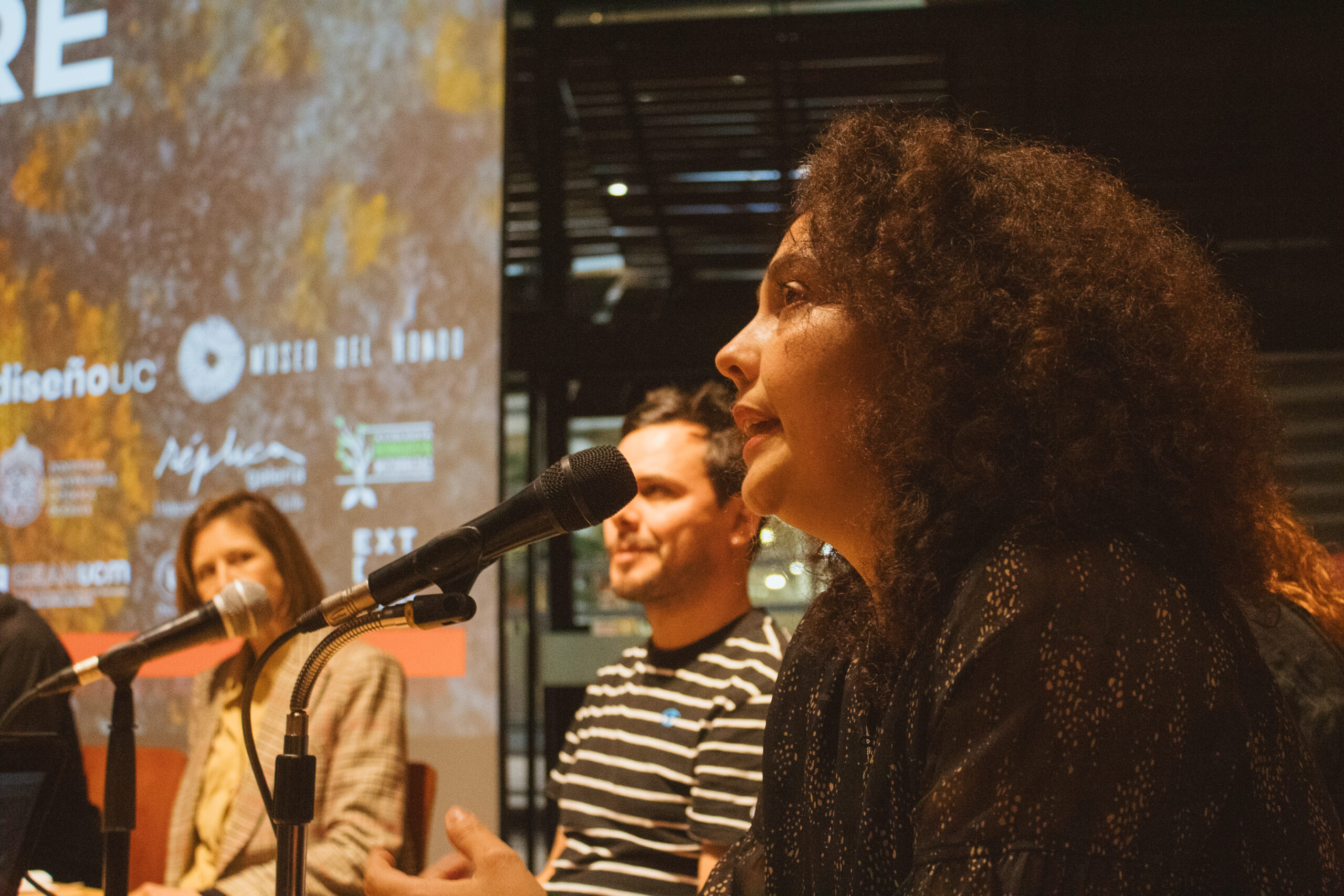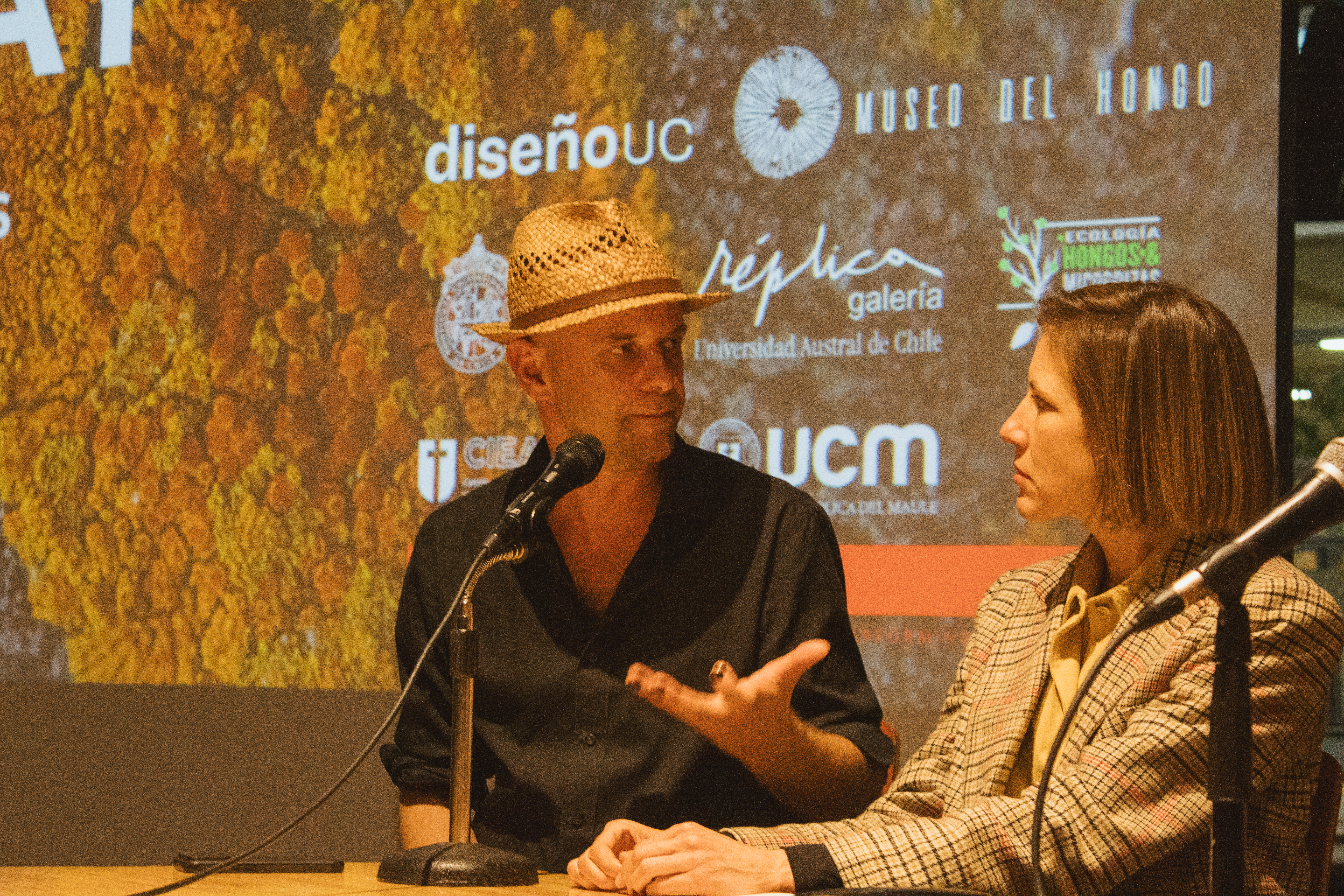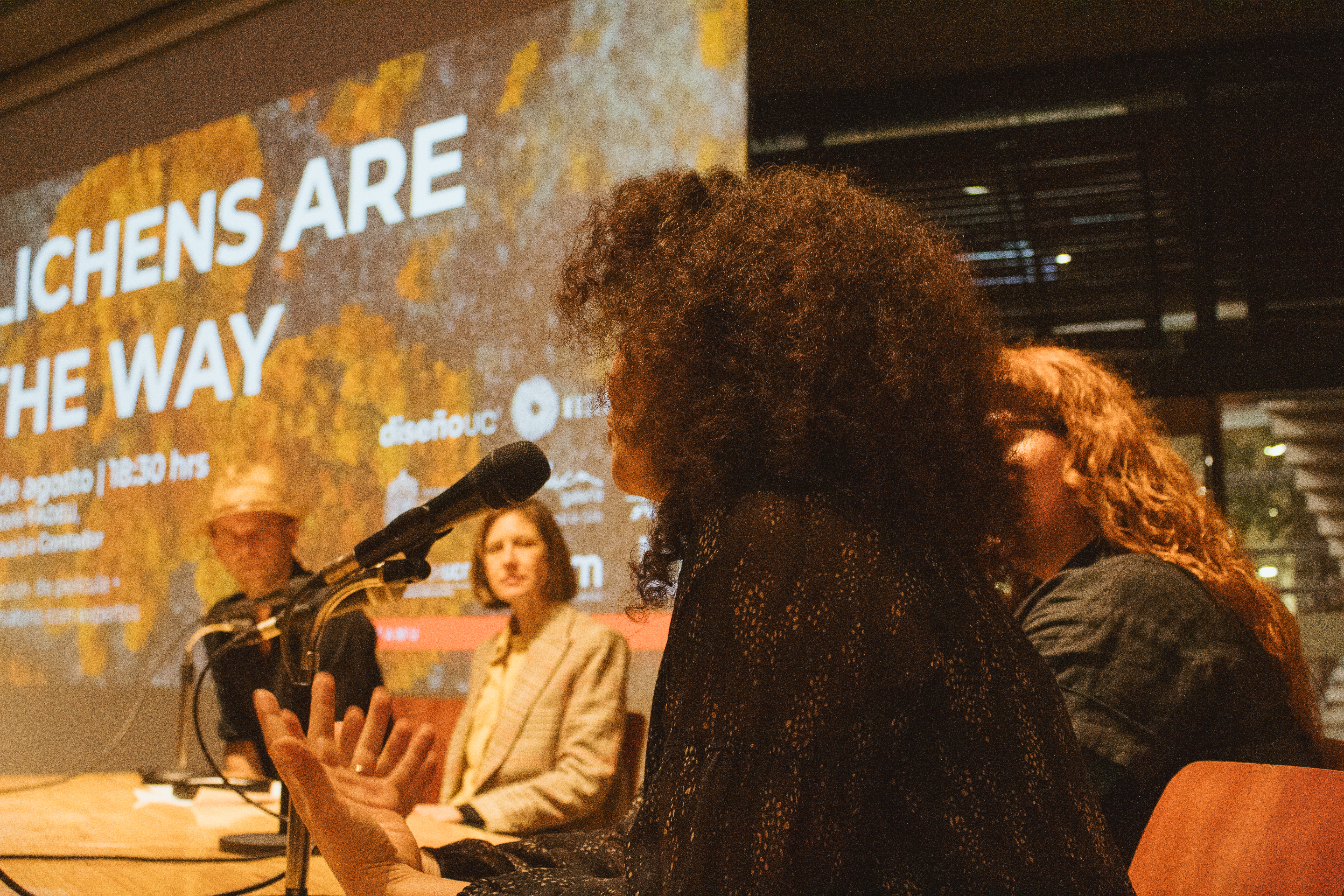 Tras la proyección, se desarrolló un conversatorio abierto en el que Vavrečka abordó los vínculos entre simbiosis, pensamiento ecológico y creación audiovisual. Para ahondar en estos vínculos, participaron del conversatorio Gabriela Fontana, orfebre chilena quien plantea que cada joya es un fragmentop del bosque, un archivo vivo que respira memoria en la piel. Gabriela, es orfebre esmaltista y Artífice en las Artes del Fuego de la escuela de Artes Aplicadas Oficios del Fuego. También, participó el docente de Diseño UC, Sebastián Rodríguez, cofundador del Laboratorio de Biofabricación FADEU UC y su investigación cruza biología, diseño especulativo y fabricación digital. Rodríguez, explora materiales vivos y formas de diseñar en colaboración con lo no humano. También participó María Luisa Murillo, artista, curadora y gestora cultural. Directora de Arte y Proyectos en la Casa-Museo Alberto Baeriswyl en Tierra del Fuego. Su trabajo se sitúa entre la memoria, el territorio y las prácticas colaborativas. Ha desarrollado proyectos entre arte, ciencia y comunidad en contextos extremos y de patrimonio natural. El conversatorio fue moderado por Andrea Moro, terapeuta, artista multidisciplinaria y fundadora de Fundación Manna.