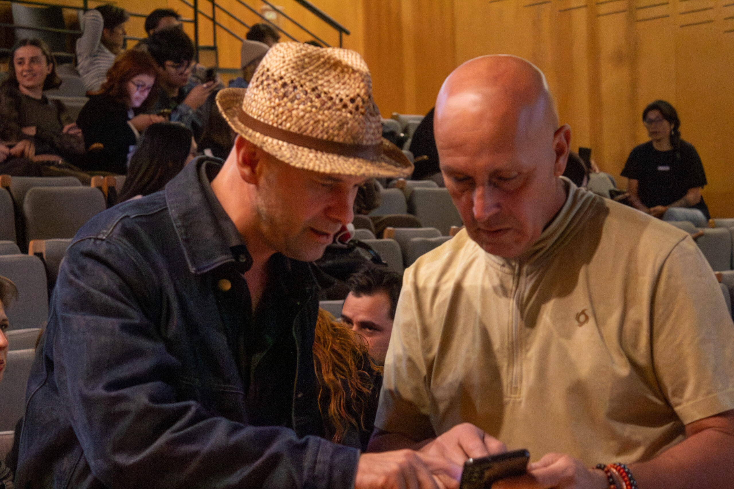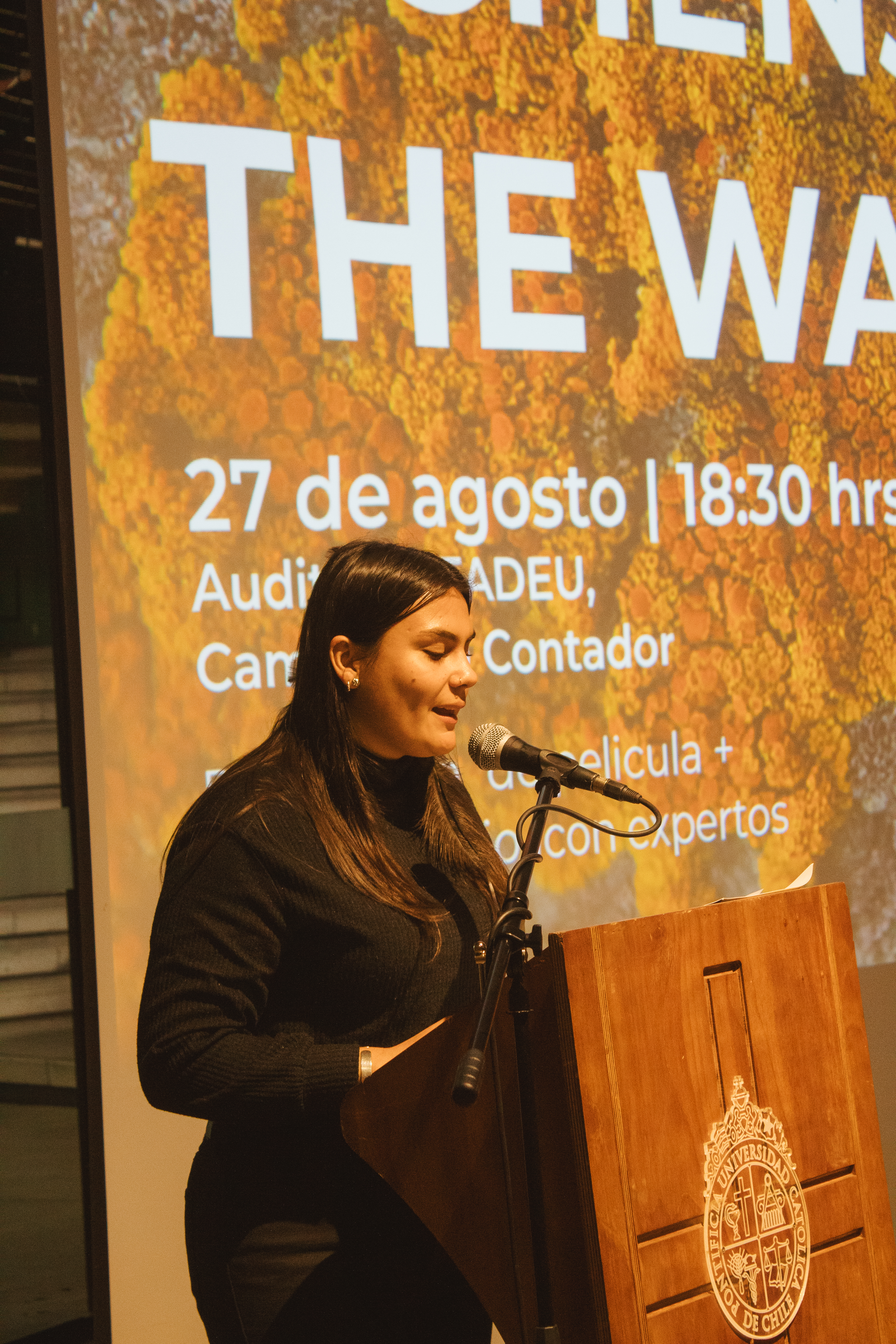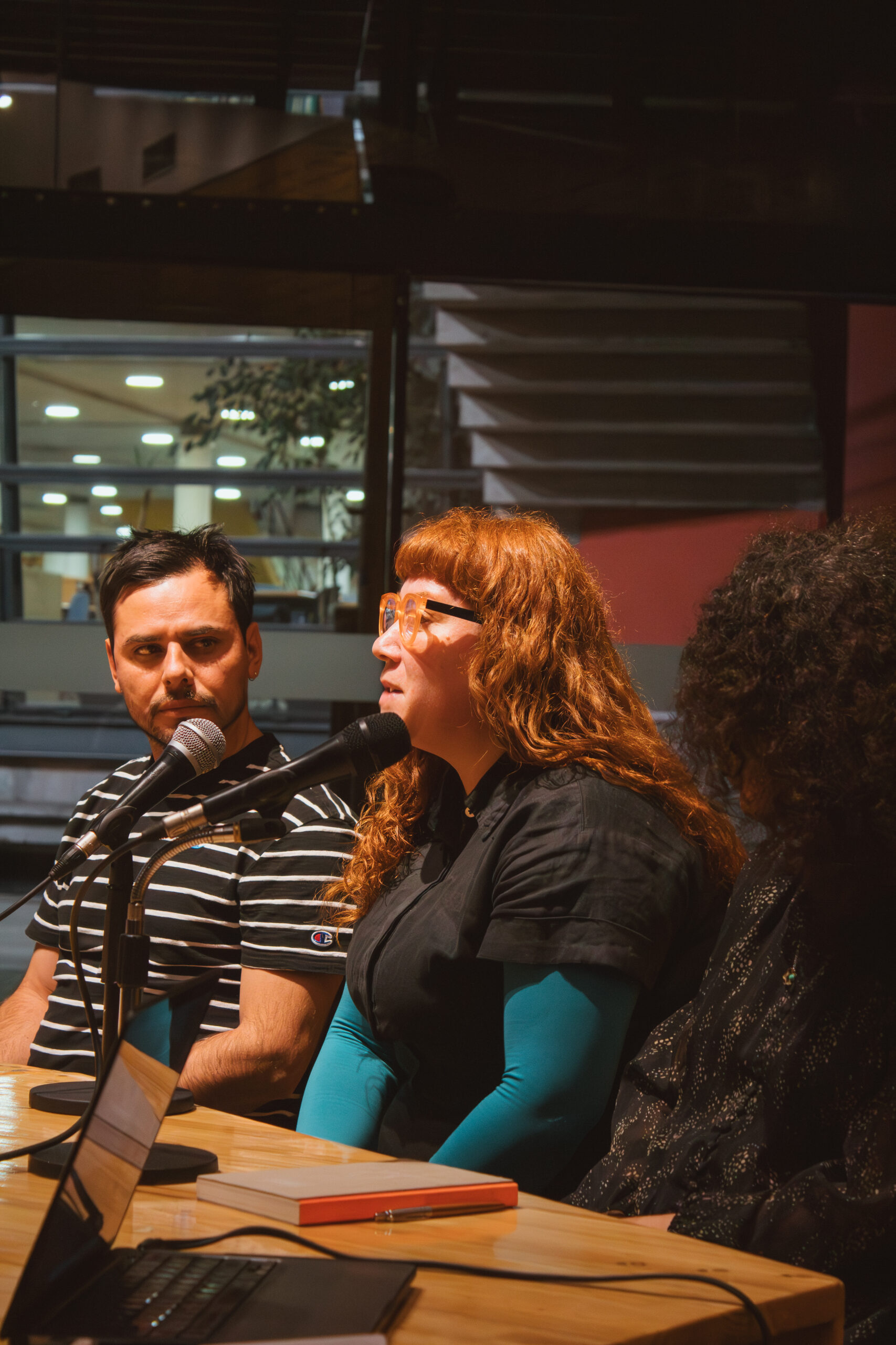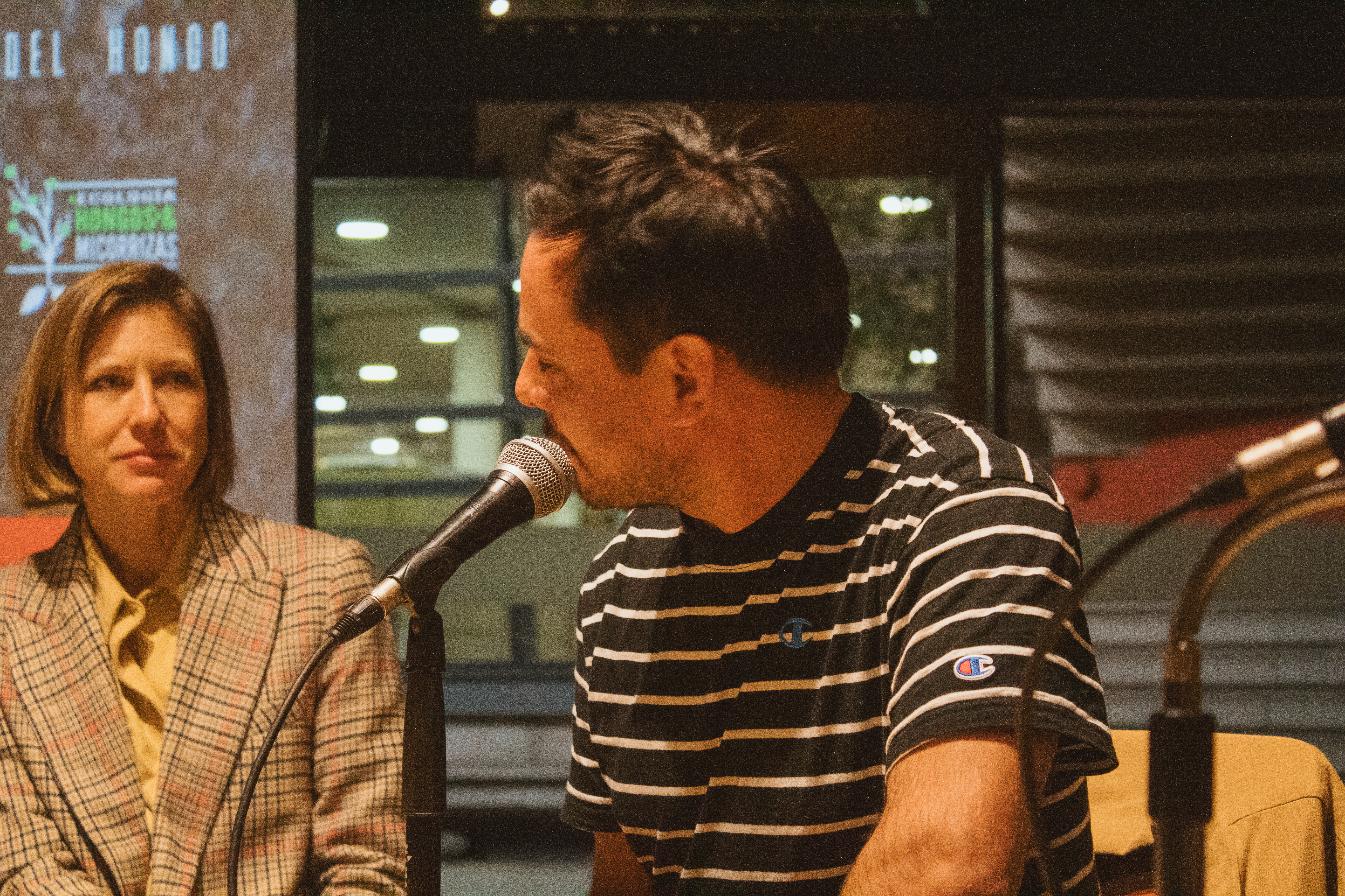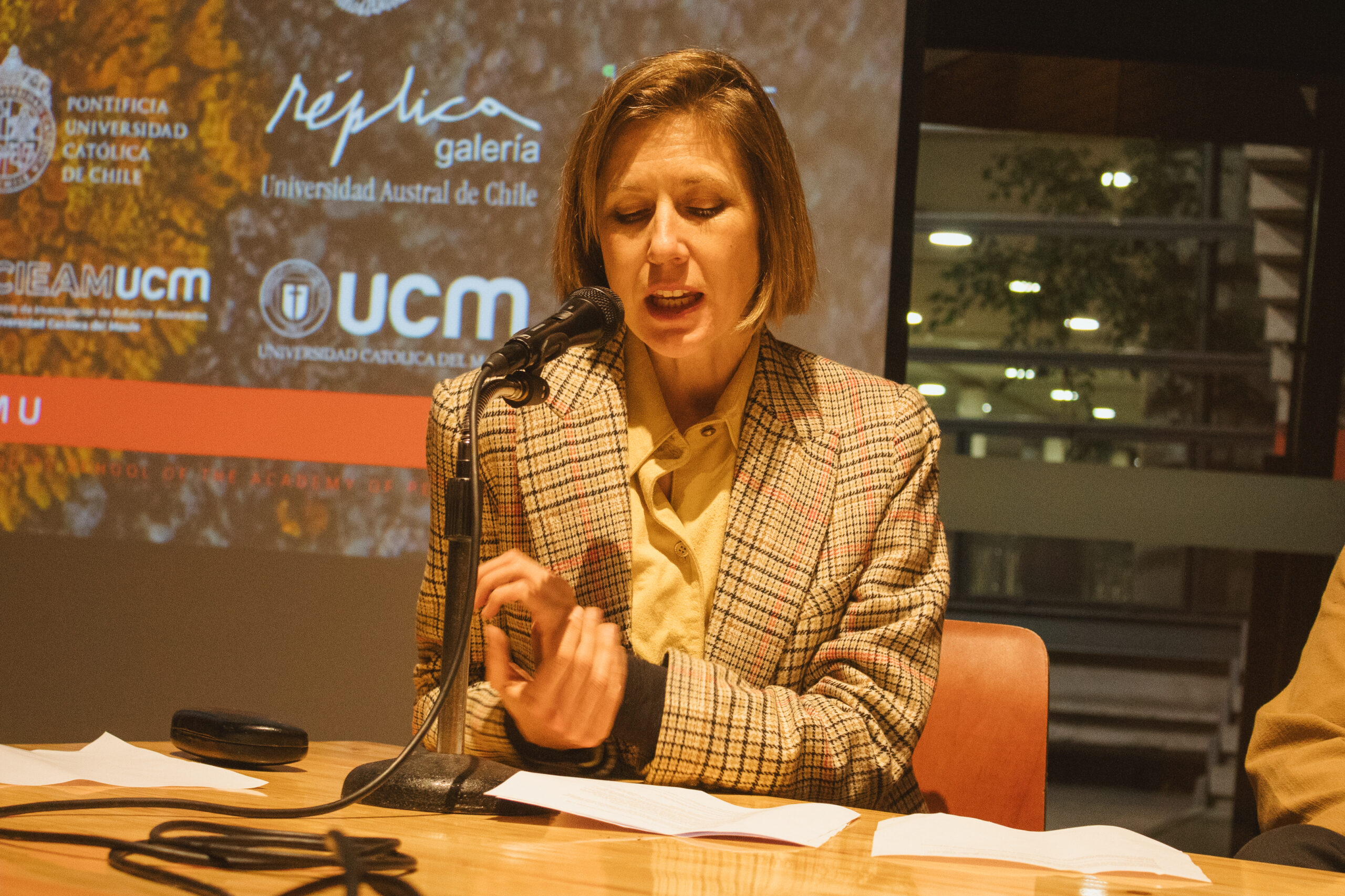 Tras la proyección, se desarrolló un conversatorio abierto en el que Vavrečka abordó los vínculos entre simbiosis, pensamiento ecológico y creación audiovisual. Para ahondar en estos vínculos, participaron del conversatorio Gabriela Fontana, orfebre chilena quien plantea que cada joya es un fragmentop del bosque, un archivo vivo que respira memoria en la piel. Gabriela, es orfebre esmaltista y Artífice en las Artes del Fuego de la escuela de Artes Aplicadas Oficios del Fuego. También, participó el docente de Diseño UC, Sebastián Rodríguez, cofundador del Laboratorio de Biofabricación FADEU UC y su investigación cruza biología, diseño especulativo y fabricación digital. Rodríguez, explora materiales vivos y formas de diseñar en colaboración con lo no humano. También participó María Luisa Murillo, artista, curadora y gestora cultural. Directora de Arte y Proyectos en la Casa-Museo Alberto Baeriswyl en Tierra del Fuego. Su trabajo se sitúa entre la memoria, el territorio y las prácticas colaborativas. Ha desarrollado proyectos entre arte, ciencia y comunidad en contextos extremos y de patrimonio natural. El conversatorio fue moderado por Andrea Moro, terapeuta, artista multidisciplinaria y fundadora de Fundación Manna.