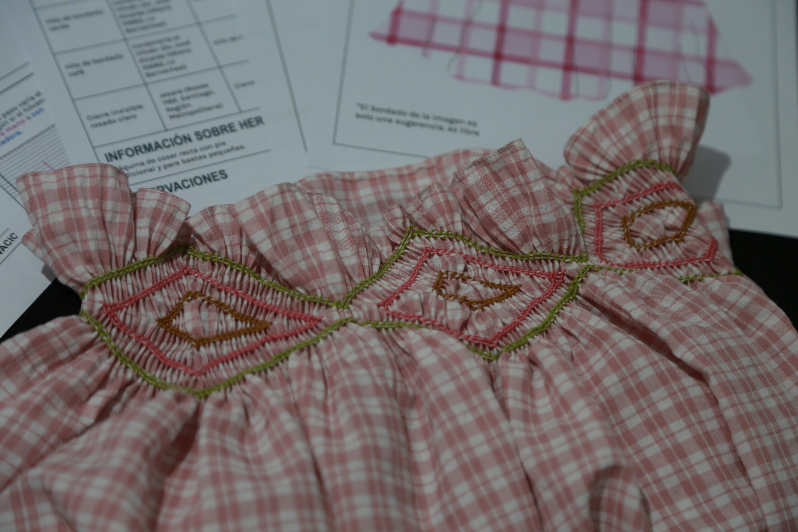 Durante los primeros meses del semestre, los y las estudiantes realizaron múltiples sesiones de trabajo con las bordadoras, aprendiendo de sus técnicas y explorando nuevas posibilidades para actualizar el smocking en propuestas contemporáneas de diseño. A partir de estos encuentros, los estudiantes desarrollaron piezas experimentales y prototipos textiles que integraron variaciones de la técnica tradicional, mientras que las bordadoras reinterpretaron esos diseños desde su experticia para llevarlos a un nuevo nivel técnico y estético.