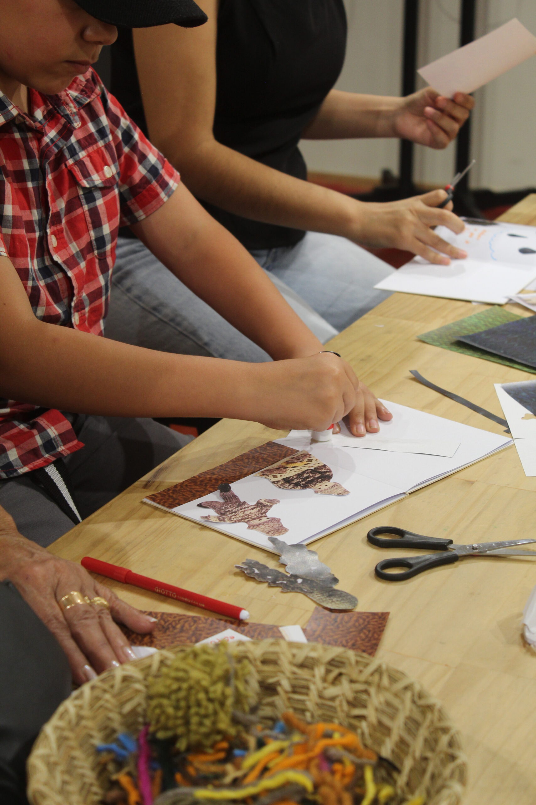 El taller reunió a participantes infantiles en una propuesta narrativa que integró collage, juego, materialidad e imaginación para la creación de cuentos desplegables inspirados en el relato El Pescador de Chiloé. A través del trabajo manual con distintos materiales, las y los asistentes fortalecieron su expresión creativa y reflexionaron sobre la identidad cultural y el valor del trabajo artesanal en el contexto del archipiélago chilote.