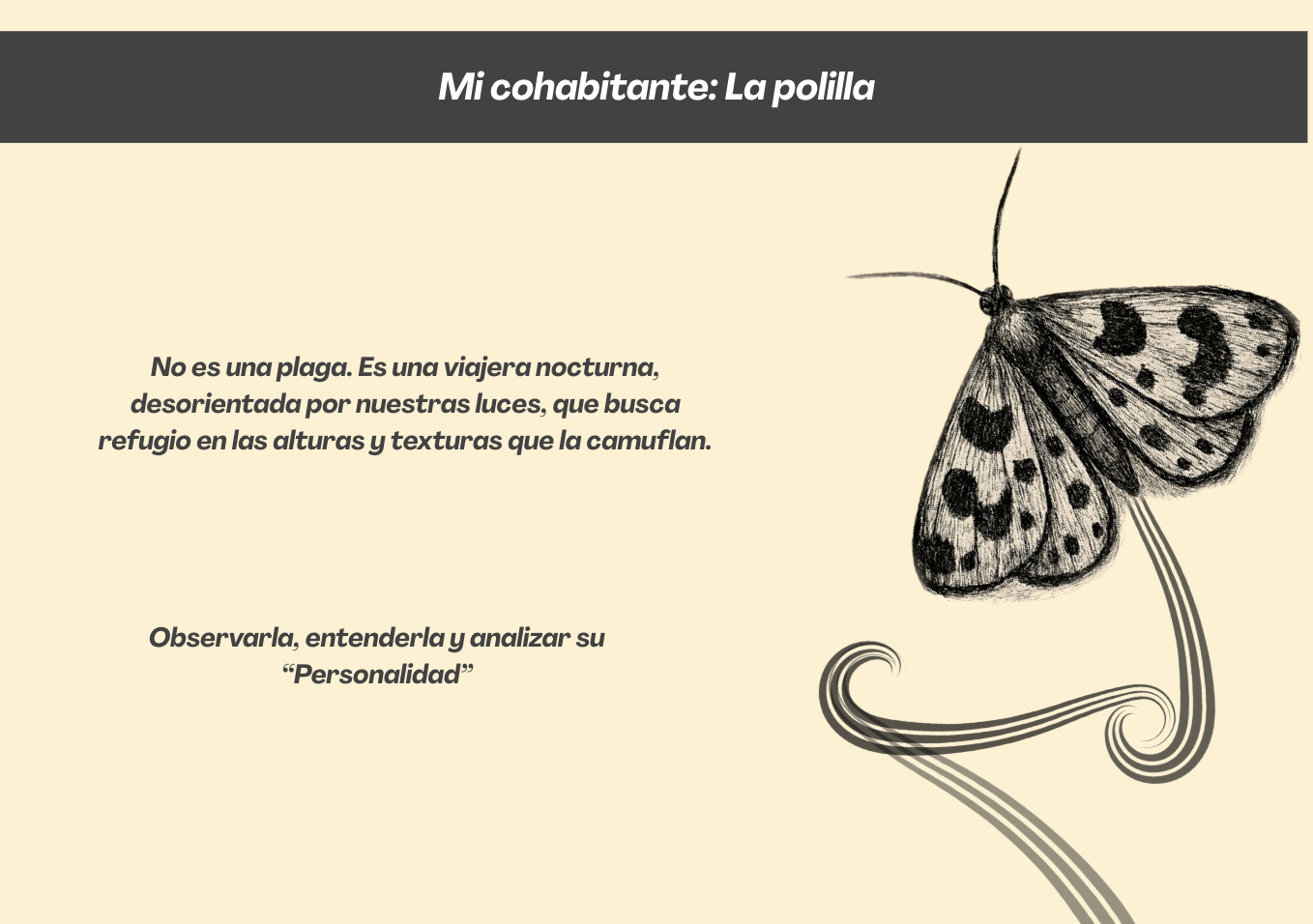 El trabajo final consistió en el desarrollo de un ejercicio de enriquecimiento ambiental con especies con las cuales las y los estudiantes cohabitan en sus entornos cotidianos. A partir de procesos de observación, cartografías y prototipado, se trabajó con perros, hámsteres, cuyes, gatos e incluso polillas, reforzando la idea de diseñar con otros y no solo para otros, uno de los énfasis centrales del seminario.
